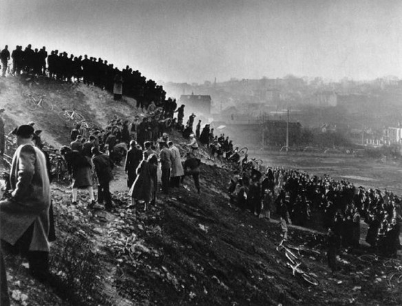 They are nice enough, these slices taken from the larger picture. It’s a good crowd scene, no doubt about it, well made and well seen at a time of cross-tensions and cross-purposes. It’s never a bad thing to look more carefully at a good photograph. This one reminds me a bit of that other crowd-scene, also on a hill, that Robert Doisneau made in 1947, Cyclo-Cross at Gentilly. The skyline is made of the same human palisade.