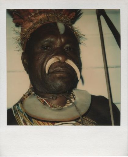 Polaroid did not pay for his Papua trip (he paid for that himself), but they equipped him generously with cameras and film. He took a blanket and a sheet to act as field backdrops (a trick he learnt from John French, whose own ex-army blanket was once lovingly restored by the V&A textiles department before appearing in a French retrospective exhibition). Another recurring backdrop is corrugated iron, which Bailey enthuses about. It’s one of the things he likes about Australia. I’ve never been to Australia, but Country Life once published a serious piece of research about the nineteenth century British firms which sent flat packed corrugated iron buildings, complete, for colonial use. You could buy a scout hut or a villa appropriate to a district officer or even a complete church. I imagine the Tin Tabernacle, just off the Kilburn High Road, in London, is one surviving example among many, although I don’t know which company made that particular one. Corrugated sheeting is an interesting choice for Bailey to have made as his background. It speaks (as do the occasional Christian crosses worn around Papuan necks) of a degree of Westernization, willing or forced, in stark contrast to the un-colonised appearance of the sitters themselves.