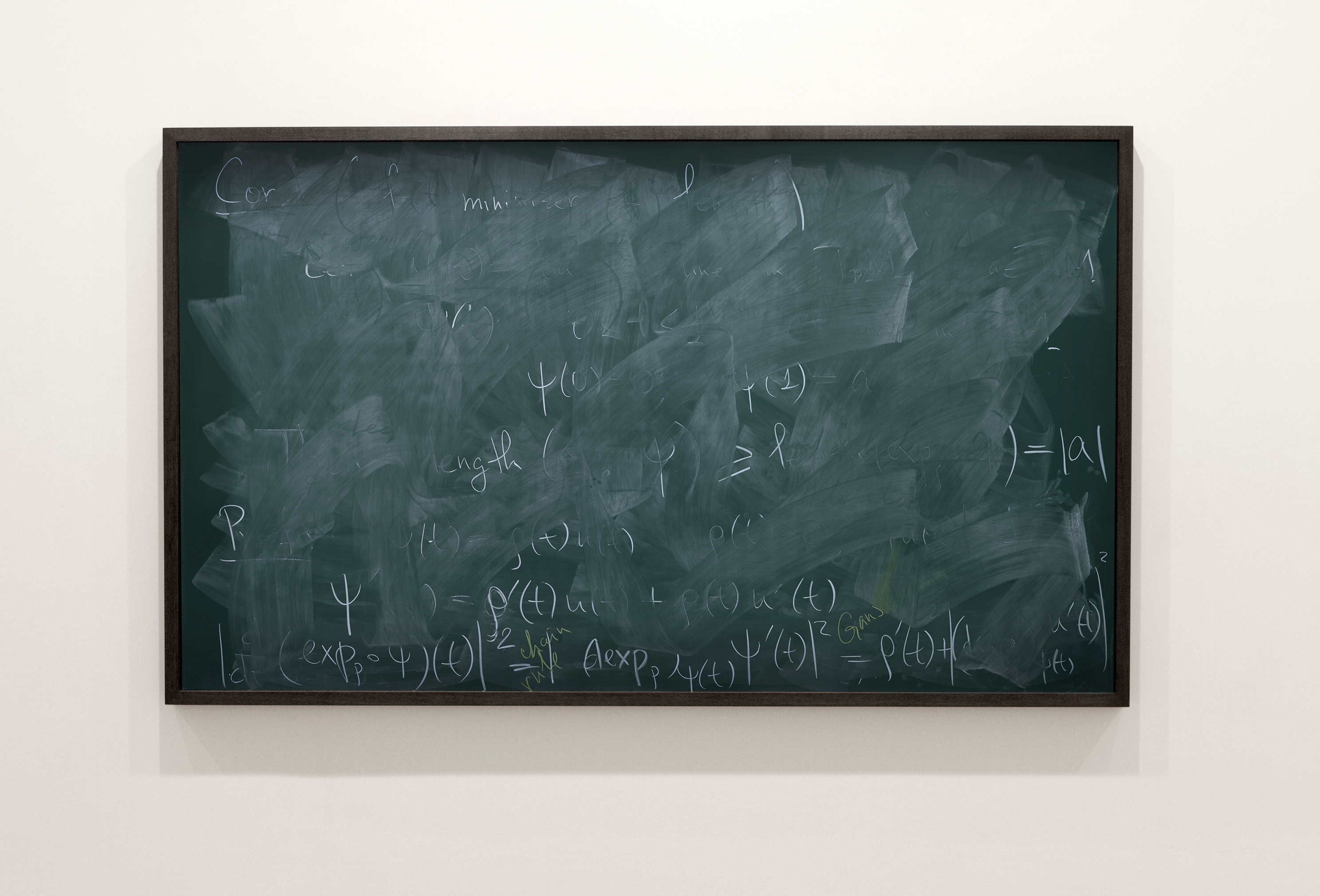 The erasures mark the transfer from one state to another. Each one, in fact, since it’s actually quite difficult to wipe a blackboard completely clean, represents a number of previous states piled on top of each other, the shadows of each both informing the next and obscuring them. These palimpsests are of course completely appropriate to the subject matter. Quantum is lots of things, but some notion of the palimpsest is certainly part of it. (Palimpsest is the term for writing that is barely discernible on manuscript that was erased and re-used: the all-but vanished layer being sometimes historically more interesting or more important than the legible one on top).