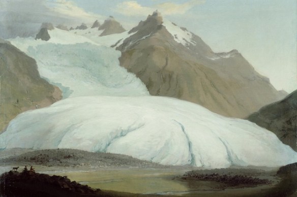 By being sited so near the passes, the glacier was curiously accessible (all such terms are relative in the high Alps, but still). For many, no doubt, that glacier was just a dreadful obstacle. But for a few, it has been a source of wonder of a particular kind. Partly by its accessibility, the Rhône Glacier was one of the great monuments of the sublime, that peculiarly eighteenth-century sentiment cooked out of equal parts of Enlightenment interest in the natural sciences, romantic laicism and the growing possibilities of travel. As Byron put it, in Childe Harold’s Pilgrimage,