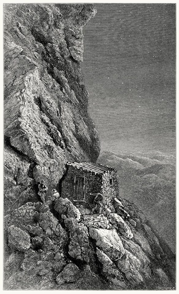 Edward Whymper’s hut on the Matterhorn, engraved c1880. His first ascent was earlier and had involved his watching helpless as a substantial portion of his party slithered to their deaths after a rope parted on the descent from the summit. The English vision of Alpinism was widely regarded as eccentric in the Alpine nations for some years, although there was of course money to be made from it by hoteliers and others.