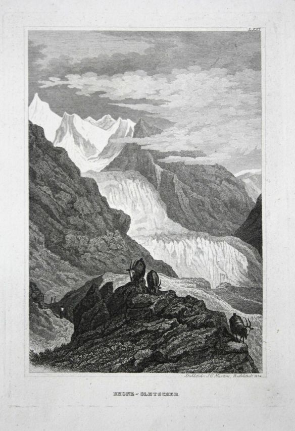 That’s the upper Rhône valley in a nutshell to the eye of eighteenth or nineteenth century travellers. As you craned your neck up to the high peaks and as the sun disappeared over the ridges and dark came early to the valleys; or as you realised that you were above the treeline, and therefore above the familiar landscapes of the lowlands, a sense of awe became the required feeling for visitors. That awe finds expression in language close to that of religion. Here’s Shelley in 1816, writing of the river Arve, that flows through Chamonix in another part of the Alps: