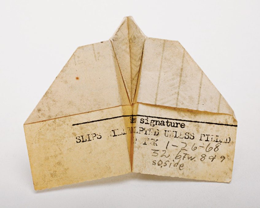 151005_r26991_e Published February 3, 2021 at 1280 × 1025 in Leaving No Tract Behind Paper aeroplane collected by Harry Everett Smith and photographed by Jason Fulford, from “Paper Airplanes: The Collections of Harry Smith, Catalogue Raisonné, Volume I”.
