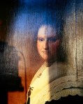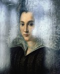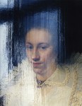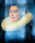 The principal effect is to find joy in the many textures in each picture. Flemish paintings are particularly good for surfaces, and Puranen dives headlong into that pleasure: here are Mechelen or Cambrai lace, velvet, and coarser cloths like broadcloth with accents of knotted rep. There are the many textures of skin, too. All that’s before he starts to explore the textures of representation itself: light bounces differently from board or canvas, from brush strokes applied with bravado or careful dabbing. In one picture an impenetrable flood of reflected light is punctured only by the half dozen blobs of a necklace in the original painting, poking through like a string of volcanic islands in a glassy sea. In another the craquelure on the surface of the paint has become a rather Dorian Gray-like commentary on the beautiful complexion it depicts. Two of them are in fact of the same portrait revisited, a stern looking Mevrouw with scallopped lace on her shoulder and a pendent necklace. In one version, she peers over a solid wall of light which reaches almost to her eyes and looks like nothing so much as a modern Moslem veil. But it takes a fifth and sixth look to notice that she is the same: Puranen’s treatment is not automatic or formulaic, and he can make thoroughly different art works from the same original just as good photographers have always been able to make widely different prints from the same negative.