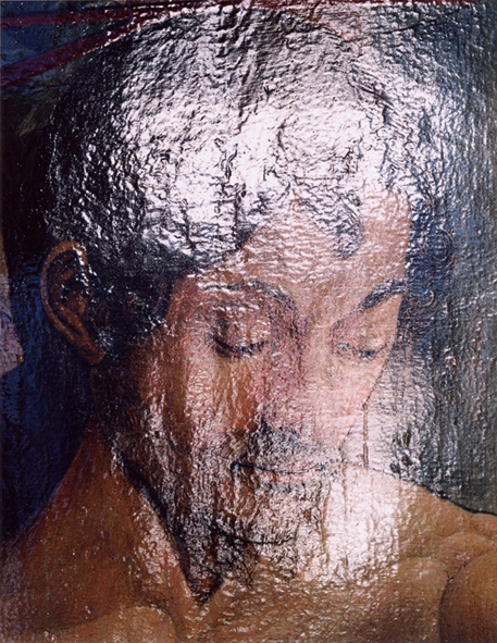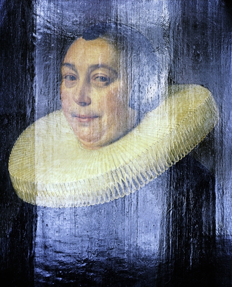 The principal effect is to find joy in the many textures in each picture. Flemish paintings are particularly good for surfaces, and Puranen dives headlong into that pleasure: here are Mechelen or Cambrai lace, velvet, and coarser cloths like broadcloth with accents of knotted rep. There are the many textures of skin, too. All that’s before he starts to explore the textures of representation itself: light bounces differently from board or canvas, from brush strokes applied with bravado or careful dabbing. In one picture an impenetrable flood of reflected light is punctured only by the half dozen blobs of a necklace in the original painting, poking through like a string of volcanic islands in a glassy sea. In another the craquelure on the surface of the paint has become a rather Dorian Gray-like commentary on the beautiful complexion it depicts. Two of them are in fact of the same portrait revisited, a stern looking Mevrouw with scallopped lace on her shoulder and a pendent necklace. In one version, she peers over a solid wall of light which reaches almost to her eyes and looks like nothing so much as a modern Moslem veil. But it takes a fifth and sixth look to notice that she is the same: Puranen’s treatment is not automatic or formulaic, and he can make thoroughly different art works from the same original just as good photographers have always been able to make widely different prints from the same negative.