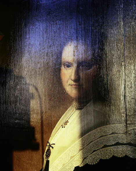 The paintings Puranen has chosen are a group of mainly Netherlandish portraits in oils of the seventeenth century, although I was proud to spot a mildly anomalous Pollaiuolo in there, too. He brings them to us with names of neither painters nor sitters. They share dark backgrounds which serve Puranen’s purposes well, and they all have a single sitter isolated within the picture space. Almost all were like that when Puranen found them: not for him the nice photographic game of finding overlooked but interesting figures in obscure corners of paintings. But they are overlooked all the same. Old master portraits en masse are not thought terribly exciting by most people, and lots of museums all over Europe have long rows of Dutch portraits getting no more than passing glances. This is Puranen’s real subject. He has found a way to bring these portraits back to life. As he once put it in an interview, the act of photographing became a form of knocking on the frame to ask if there was anybody within. Using daylight only, Puranen draws a curtain around each portrait which he then partially pulls back to invite us in.