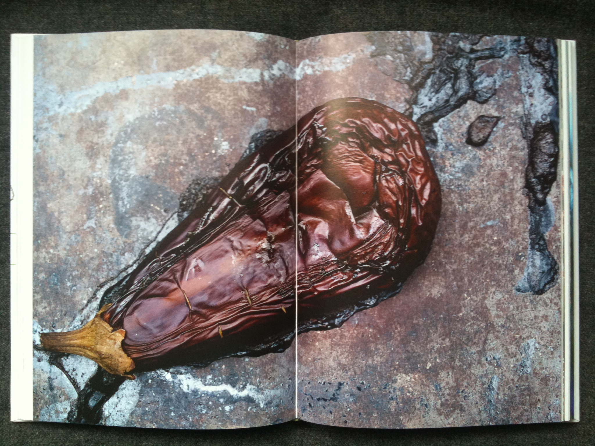 The picture has been open at my elbow for the two or three minutes it has taken to write these words, and let me tell you, I would no more eat the depicted smoky frittata than I would lick the linoleum in my local A&E. I have seen cleaner burger vans in lay-bys on the long slow drive down to Cornwall. This is grubbiness pushed too far. On the double spread pp.118-119 (in a section entitled without hint of either irony or wit The Mighty Aubergine) is a picture which looks at first sight, and at second, and at third, exactly like a horrified, peering, too-close-for-comfort view of road kill. It is actually an aubergine.